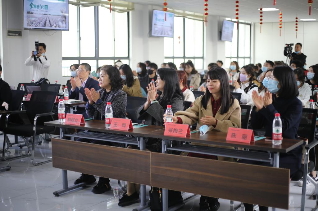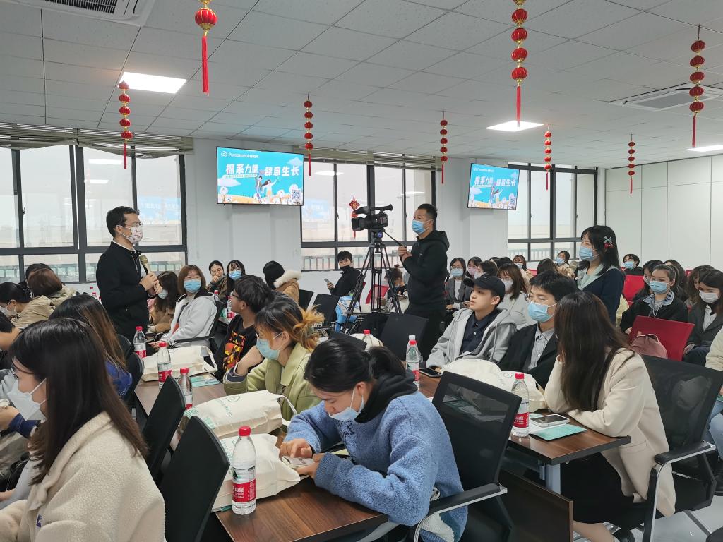 活动的第一站,师生们来到位于天地壹方购物中心四楼的全棉时代门店进行参观。公司华中区域经理龙金武先生作为主讲人向师生们讲解了全棉时代的品牌历史、品牌文化和核心技术载体。在整个门店参观、讲解过程中,龙金武先生提到最多的一句话是“最核心的材料是棉”。他们尽量减少化纤的使用,希望减少地球污染,减少碳排放。