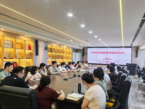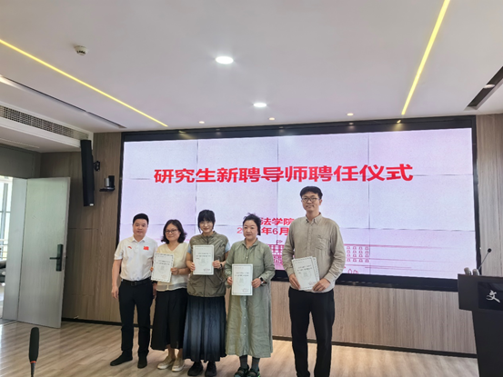 会议第一项为研究生新聘导师聘任仪式,院长田北海为新聘研究生导师赵珞琳、雒仁启、戴秋燕和胡程立颁发聘书。
