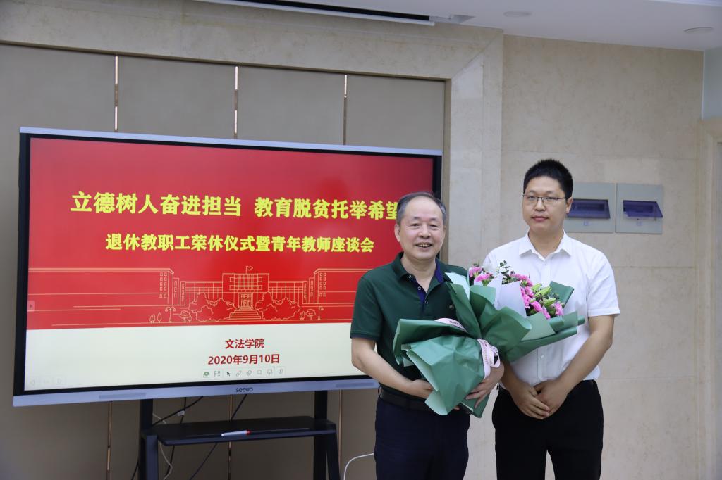9月10日上午,学院在人文楼M612举行退休教职工荣休仪式暨青年教师座谈会,庆祝第36个教师节。学院班子成员、钟涨宝教授、张燕教授、霍军亮副教授、王灿老师学生代表颜永伟、近三年入职的教职工、全体行政管理人员参会,会议由学院院长田北海主持。
