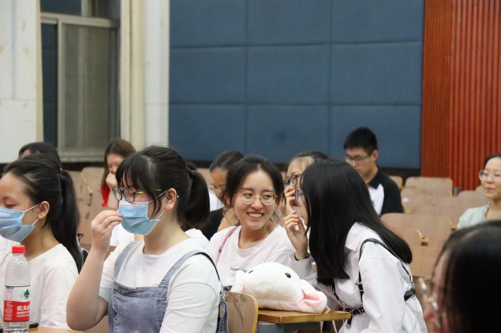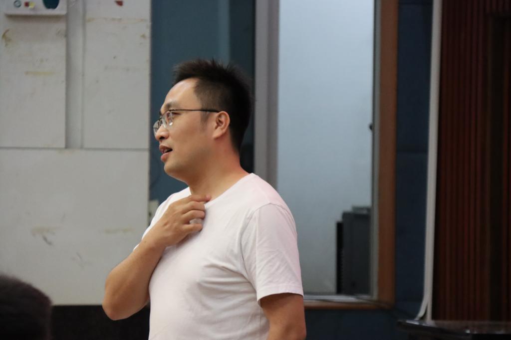 接下来,沈老师从发声和呼吸两方面给大家带来了实用的练习技巧 “人声就像管子里的弦乐” ,沈希飞打了一个有趣的比方,“人体是一个管子,而气息划过声带就像琴弓拉响琴弦。”他亲自示范练习发声的方法,要求大家开始练声的时候要轻轻地把声带振响,找到一种“风轻轻划过树叶”的感觉。然后,他又邀请现场的声乐特长生同学一起分享了练习腹式呼吸的方法。“现在想象你的手是一朵鲜花,深深地吸一口气......”在有趣的练习中,现场的同学们逐渐了解了发声和呼吸的基本技巧,笑声和认真的练习声一次次回荡在会场。