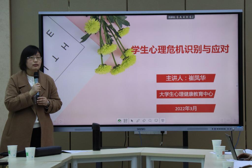 随后,会议邀请学校大学生心理健康教育中心崔凤华老师就学生心理危机识别与应对措施进行了分享,她首先对心理危机做出了介绍,针对大学生在大学普遍产生的心理危机提出了危机干预的三步骤——预防、识别、干预,并分别就这三个步对班主任老师提出了建议,呼吁班主任要关心学生的心理健康。