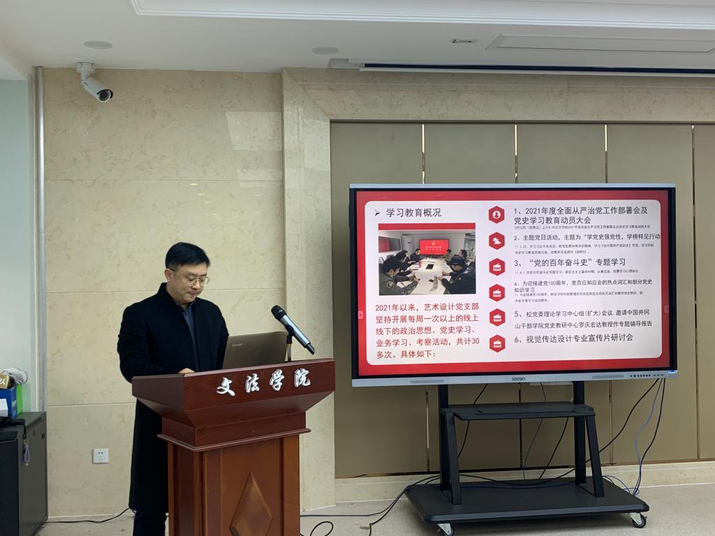 艺术设计系教工党支部书记邓玉璋介绍了支部的政治学习情况及学习成效。他从基层组织运行、学习方式以及实践行动三个方面指出现阶段支部存在的问题,并进行反思,提出要在提高学习效率,发挥党建引领作用等方面继续努力。