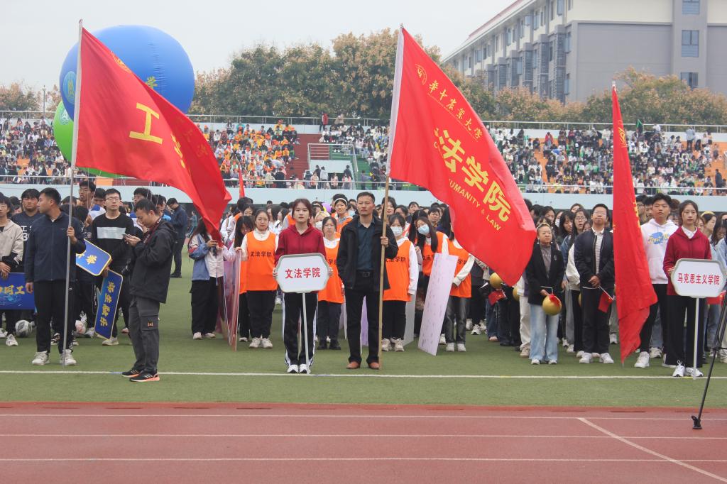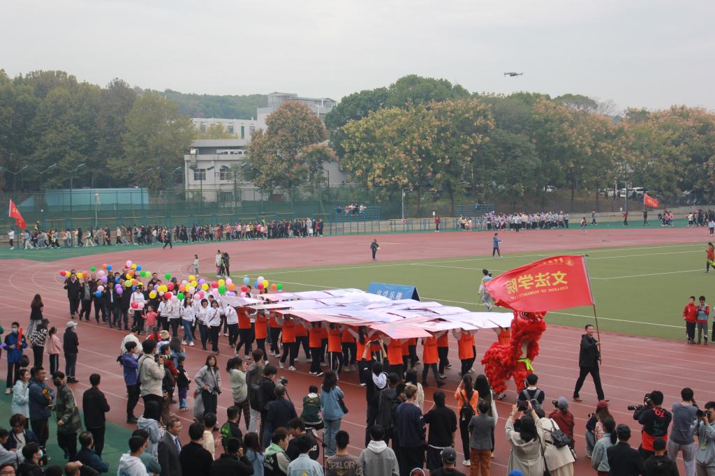 的方阵由28位入党积极分子和学院教师组成,在整齐的口令下,身着“文法橙”马甲的入党积极分子高举起纸板,拼成“文法运动”的字样,老师们手持彩色气球,在“文法登场,斗志昂扬”的口号声中他们走过主席台,向观众展现文法风采。