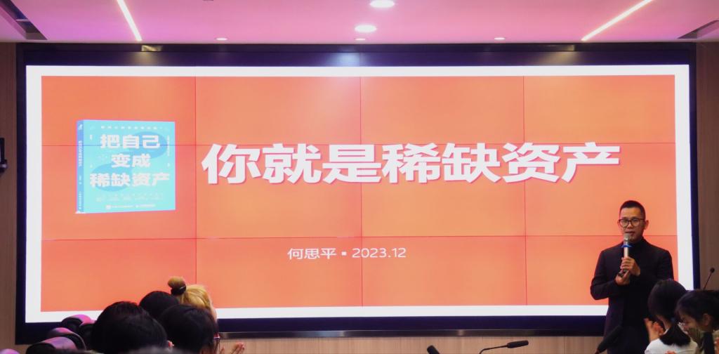 讲座伊始,何思平回望了他的在校时光与创业经历,指出“大学不是谋生的手段”“人的价值在于创造”。接着,他鼓励大学生要勇于尝试、敢于走出舒适圈并针对在座同学提出的“如何将理想转化为现实”这一问题,从其出版的著作《把自己变成稀缺资产》出发,结合自身经历,围绕认知力、行动力、生命力三个方面分别进行了解答阐释。
