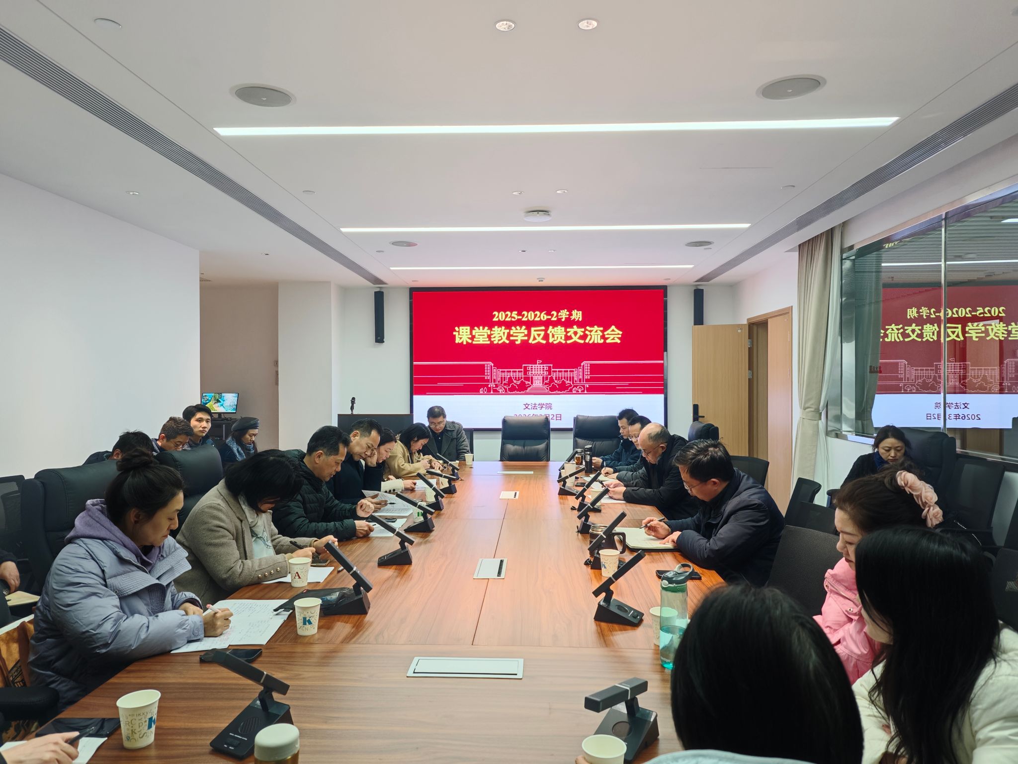 2025-2026-2学期“开学第一课”教学反馈交流会在人文社科楼546会议室举行。学校正处级纪检监察员李仁刚、机关党委书记王平详、党委统战部副部长吴珊、本科生院运行管理处处长肖湘平、本科生院崔蕴涵、学院党委书记刘广乐、院长田北海教授、院班子成员、系(部)主任、支部书记、基层教学组织负责人以及授课老师等参与了本次反馈交流会。会议由教学副院长孙站成主持。