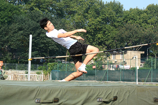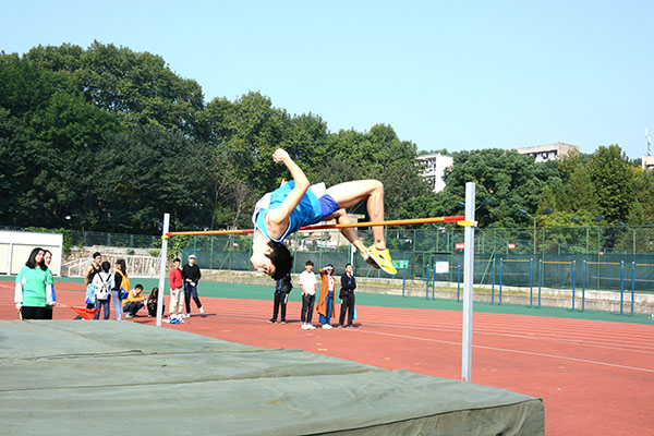 的梁犇鑫同学,工学院的张弛同学还有经管院的翁辉煌同学。只见他们充满爆发力的助跑,到达杆前,一跃,观众还没反应过来,就见到他们落到了垫子上。杆再次上升到了一米八五,三位同学有惊无险的过了杆,比赛尚在同学们的惊呼声中继续进行。比赛结果最终是经管院的翁辉煌同学获得了冠军,定杆一米八九。比赛结果虽然很重要,但大家都能秀出风采,也是一种水平。