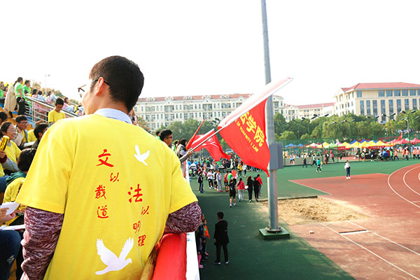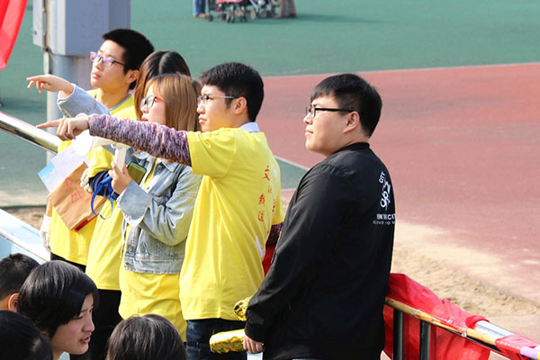 运动场的看台上有那么一群人,他们手里握着鼓槌,有节奏地敲击着牛皮大鼓;他们拿着扩音器,代领同学们一起喊口号“文法强,文法棒,文法就是不一样!”;他们手握着加油棒为场上的运动健儿们加油鼓劲儿。他们就是文法组织部的工作人员们,这些学姐学长们早上五点多便要起床,六点钟到达看台,要一直在看台上待到下午五点半,期间还要搬运物资,组织同学们签到、喊口号,维持秩序。文法组织部的李嘉琛同学说:“虽然一天下来很累,人多不好组织,但是同学们还是很配合的,为选手加油鼓劲儿的时候也很热情,很给力!”