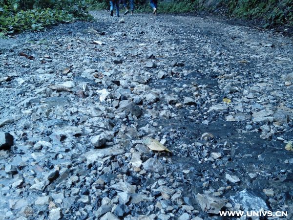 从学校到张保平我们跟着孩子们步行了五十多分钟,有一个六岁的女孩儿没穿袜子,脚被早已半湿的鞋子磨破,我们只能给她垫上卫生纸。接着行走的她也始终走在一行人的前面,不曾哭泣,也不曾撒娇。她有着比我们更强大的忍耐力,甚至一路唱着《童年的太阳》,欢快,愉悦,如同山林间快乐的精灵。