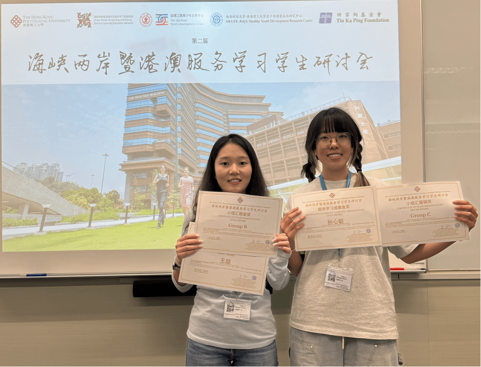 在小组汇报部分,王喆同学与来自台湾东华大学、汕头大学、香港理工大学等5所高校的同学组成跨校小组,以多个服务学习案例为基础,共同探讨服务学习如何同步促进青年成长与社区发展。小组汇报《由实践出发:探讨服务学习对学生成长与社区连结的双重意义》荣获金奖。孙心聪同学与来自同济大学、澳门大学、郑州大学等高校的5名同学合作,从组员参与的不同服务项目出发,分析学生在服务中的角色转变及其所带来的多维社会价值。小组汇报《从“被服务”到“服务构建”:角色跃迁下的社会价值多维实践与跨域分析》斩获银奖。通过这次的服务学习分享,参与者不仅与不同教育及文化背景的伙伴展开深度交流,增强了对跨学科合作的实际感知,也进一步拓宽了国际视野与跨文化理解能力,收获了丰富且具有启发的学习体验。